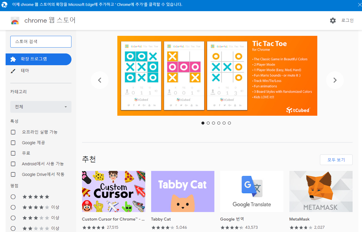 Edge에서는 크롬 웹스토어의 확장프로그램을 지원합니다. 그렇기 때문에 Edge검색참에 크롬 확장프로그램을 입력하시면 아래와 같은 페이지에 접근 가능합니다.