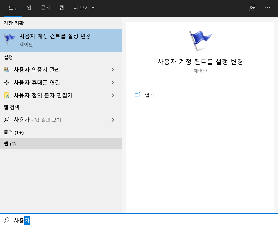먼저 윈도우 버튼을 클릭 후 검색창에 "사용자"를 입력합니다.