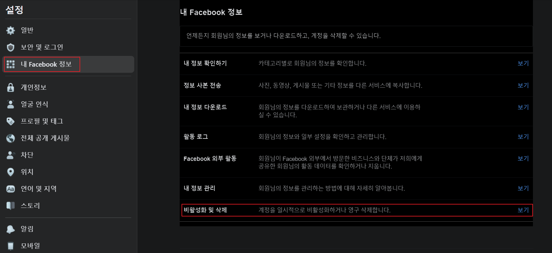 2. 설정 좌측의 내 Facebook 정보를 클릭후, 비활성화 및 삭제의 보기 버튼을 클릭합니다.