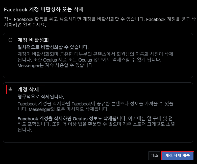 3. 아래의 계정 삭제를 선택 후 계정 삭제 계속을 선택합니다.