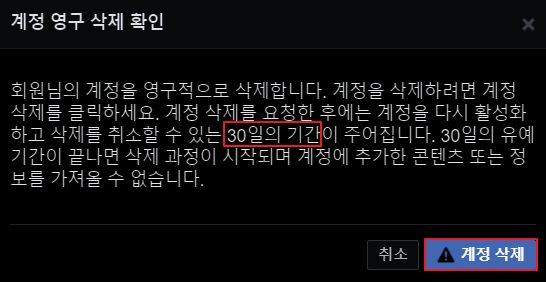4. 계정 영구 삭제시 아래의 정보가 함께 삭제되니 꼭 유의해주세요. 또한, 30일의 유예기간이 있기 때문에 계정을 삭제하였다 하더라도 30일안에 취소할 수 있습니다.