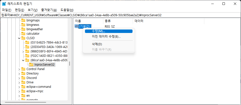3. 위의 폴더를 생성한 뒤 폴더에서 새로만들기 -> 키를 생성해주세요. 폴더명은 InprocServer32 로 만들어주세요.