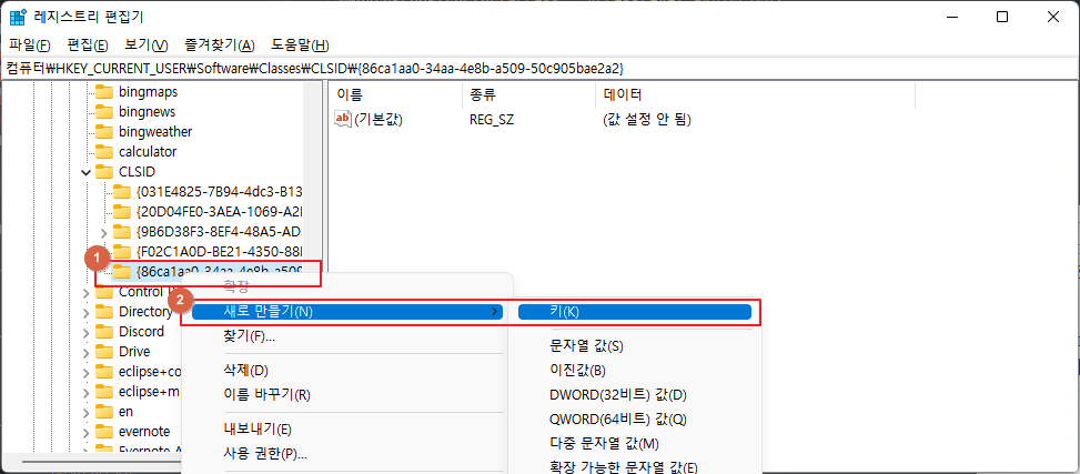 2. 레지스트리화면에서 아래의 주소창에 컴퓨터\HKEY_CURRENT_USER\Software\Classes\CLSID 를 붙여넣어줍니다. 그리고 해당 위치에서 새로만들기 -> 키를 눌러준 뒤 해당 {86ca1aa0-34aa-4e8b-a509-50c905bae2a2} 로 폴더명을 만들어주세요.