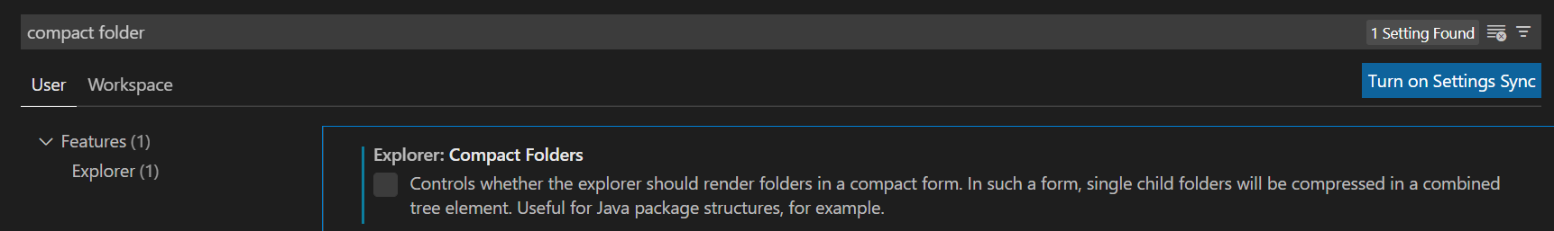 Window의 경우 ctrl+,로 설정화면으로 이동후 compact folder를 검색 한 후