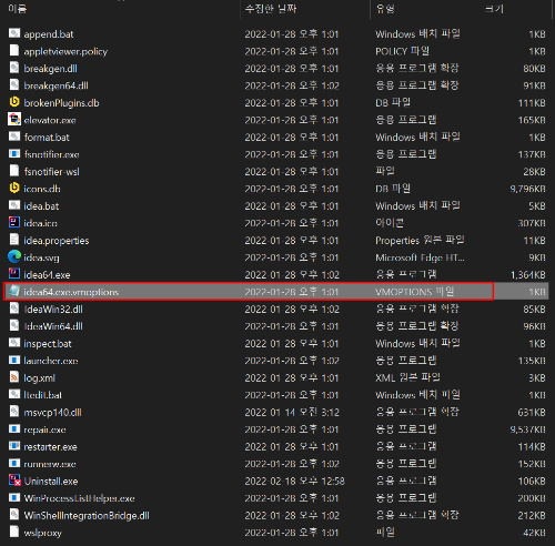 아마 일반적으로 설치하시면 C:\Program Files\JetBrains 의 안에 있습니다. 제 경우는 2021.3월 버전이어서 C:\Program Files\JetBrains\IntelliJ IDEA Community Edition 2021.3.2\bin 에 위치해 있네요.