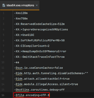 idea64.exe.vmoptions 파일을 열고 가장 밑에 -Dfile.encoding=UTF-8 을 입력해주면 됩니다.