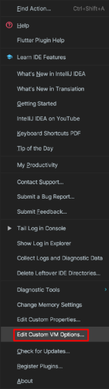 IntelliJ를 실행 후 상단의 help 텝을 선택합니다. 목록 중 Edit Custom VM Options... 를 선택합니다.