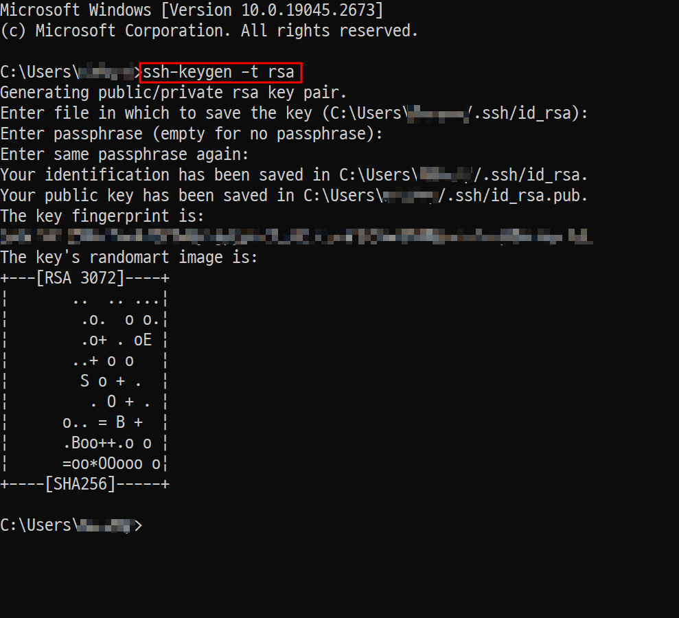 위 명령어를 실행하면, SSH 키 생성 대화상자가 표시됩니다. 키 생성 대화상자에서 키의 저장 위치, 키의 암호 등을 설정할 수 있습니다. 설정이 완료되면, 키 쌍 (공개 키와 개인 키)이 생성됩니다.