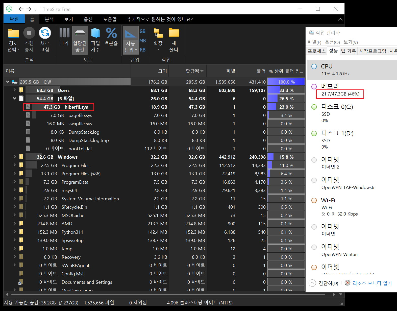 - **hiberfile.sys**는 Hibernation(휴면) 기능과 관련이 있습니다.