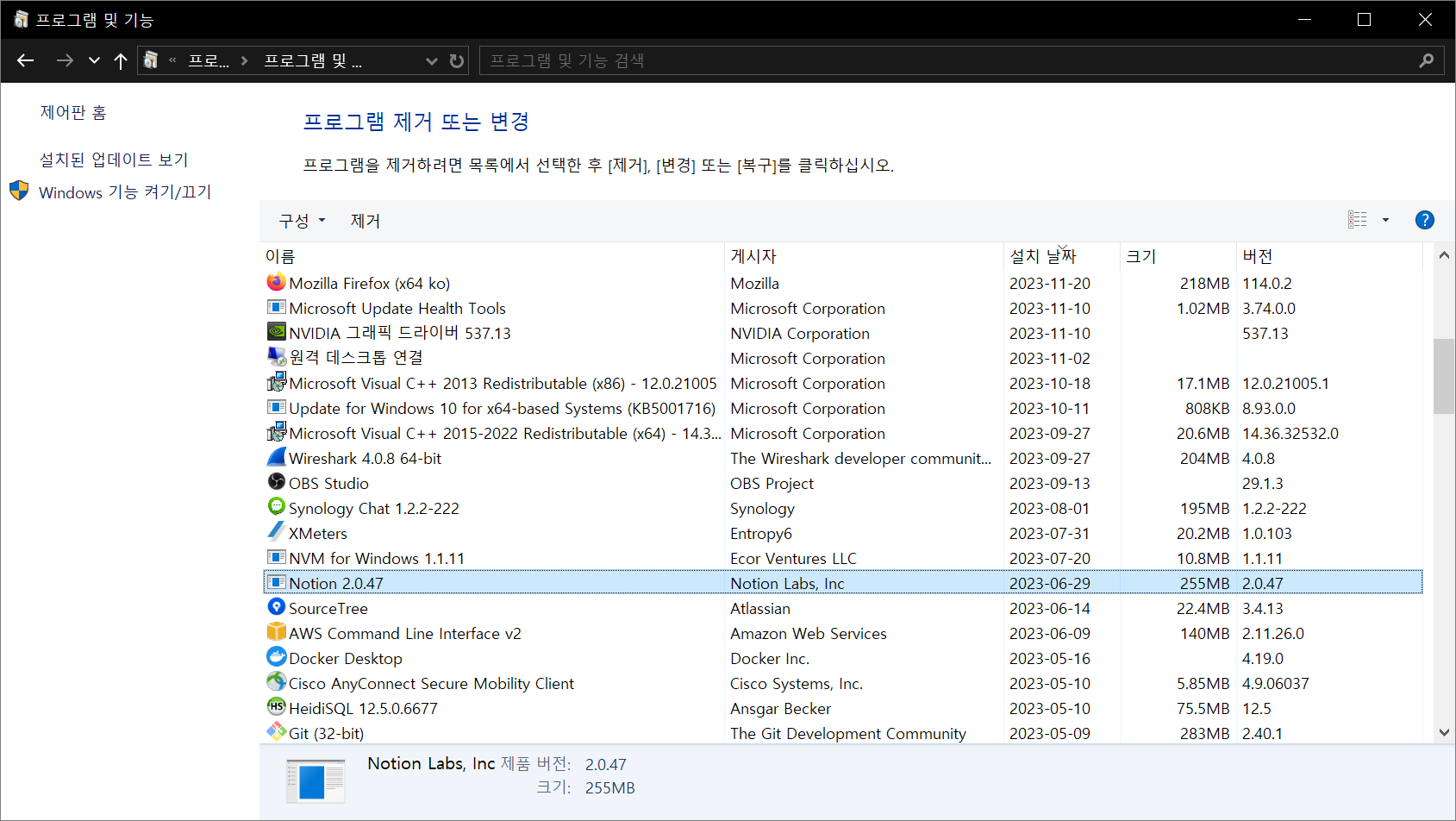 근 컴퓨터를 정리하면서 사용하지 않은 앱을 삭제하다가 Notion 프로그램이 2개나 설치 돼 있는 것을 봤습니다.