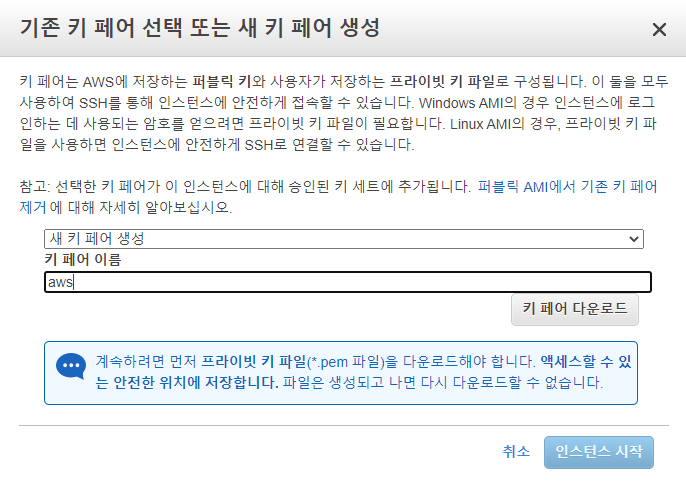 이렇게 설정해주신 후 우측 하단의 시작하기를 클릭하시면 키 페어 생성 팝업이 뜹니다.