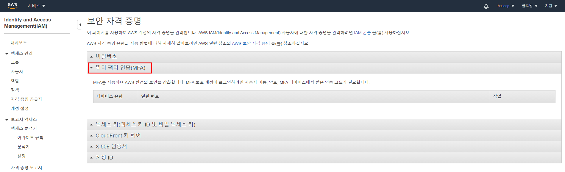 우선 aws사이트에서 회원가입을 하셔야 합니다.(신용카드 입력 필수) 본 포스팅에서는 회원가입은 생략하여 진행합니다. 그렇지만 보안 인증은 하시는 것을 추천드려요. 로그인 후 우상단 로그인 유저 이름을 클릭하면 내 보안 자격증명이라는 텝이 있습니다. 해당 텝에서 멀티 팩터 인증은 꼭 하시길 바랍니다. 은행이나 게임의 OTP처럼 휴대폰에 2차 보안을 할 수 있는 것입니다. AWS에서 폭탄 과금 사례가 종종 있다고 들었습니다.