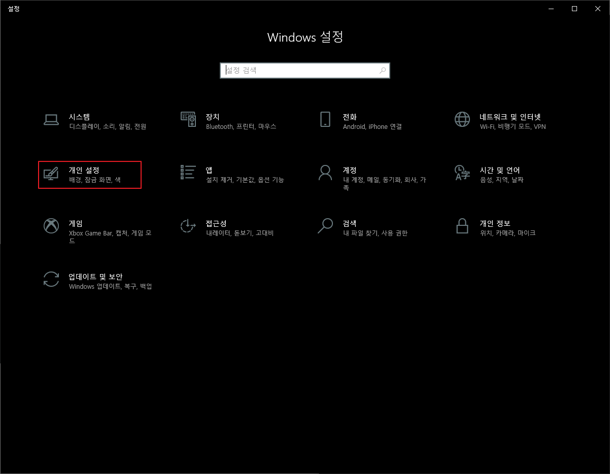 윈도우 환경설정을 들어가서 개인 설정에 들어가줍니다.